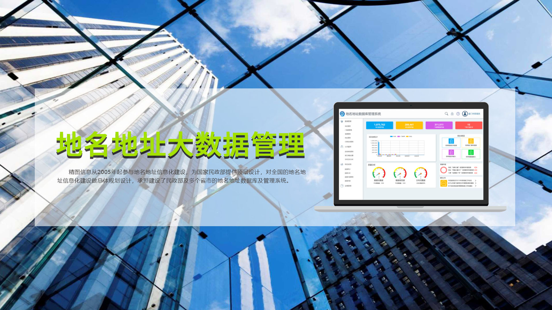 創(chuàng)立于1999年,是北京飛利信科技股份有限公司(股票代碼:300287)子公司,是國(guó)家創(chuàng)新型企業(yè)、國(guó)家火炬計(jì)劃重點(diǎn)高新技術(shù)企業(yè);獲批建有福建省博士后創(chuàng)新實(shí)踐基地、福建省院士專家工作站、廈門市院士專家工作站。精圖信息承擔(dān)了國(guó)家發(fā)改委、國(guó)家工信部、國(guó)家科技部、國(guó)家住建部、國(guó)家民政部等重大和重要專項(xiàng)50多項(xiàng),主導(dǎo)和參與制定國(guó)家和行業(yè)標(biāo)準(zhǔn)、規(guī)程、導(dǎo)則60多項(xiàng),擁有自主知識(shí)產(chǎn)權(quán)的專利和軟件著作權(quán)500多項(xiàng)。